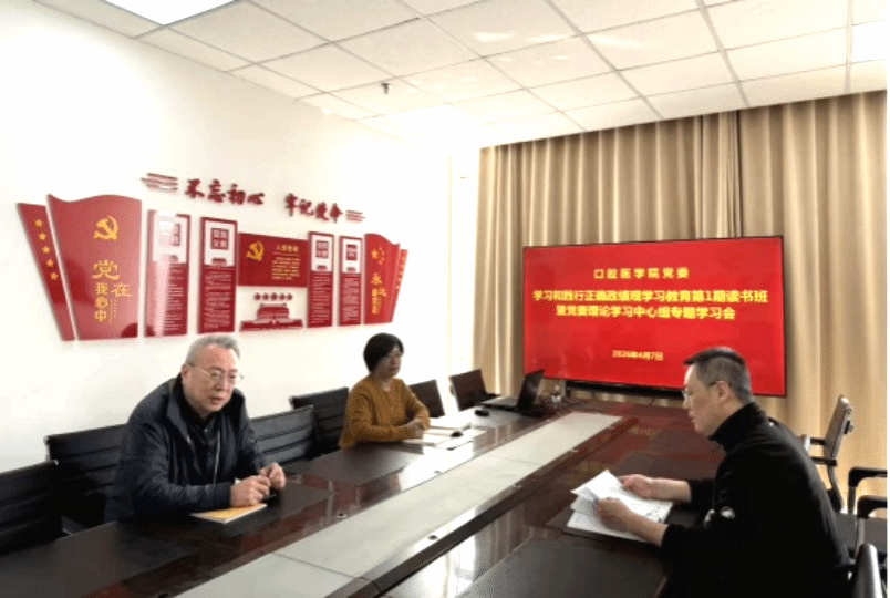 2026年4月7日,口腔医学院召开树立和践行正确政绩观学习教育第1期读书班暨党委理论学习中心组专题学习会,学院领导班子成员参加本期读书班,会议由学院党委书记赵宇丹主持。